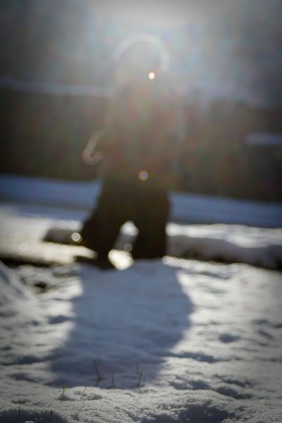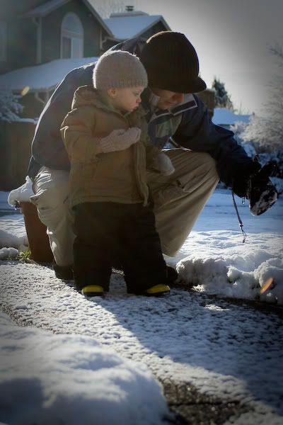 Of course, we had to take advantage, so we bundled (I mean, BUNDLED) Ben up in his first snow suit... complete with hat, gloves, coveralls, boots, and fleece. Only problem was, we could not find the right fit for all of his gear. His coveralls were way too big (I had to roll them up) and his boots just kept falling off of his feet. He was a little modge podge marshmellow and he was NOT having it... The fact that he had a bit of a cold, didn't help matters either. That said, we didn't spend very long outside, nor was able to get very many "snow" shots of him in his little snow apparel. However, i did capture these...